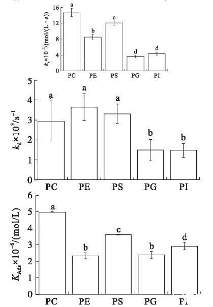 圖4初始表面壓力為25 mN/m的條件下VhPLD對PC、PE、PS、PG和PI的吸附動力學參數