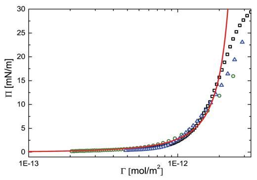 圖 2 表面壓力(P)與吸附的 PNIPAM 顆粒量 (G) 在空氣-水界面上。 開放符號表示實驗 對應于三組不同實驗的數(shù)據(jù)點 即:(,)具有高初始粒子負載的 NIMA 槽,(B)NIMA 低初始粒子負載的槽和 (D) Kibron m 槽 高初始粒子負載。 紅色實線表示預測 使用 Groot 和 Stoyanov 模型制作。