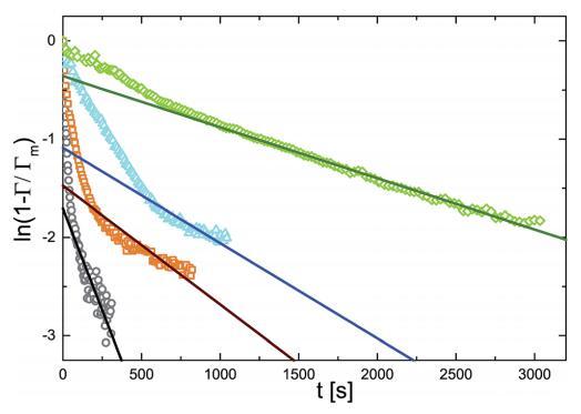 圖 6 ln(1 - r/rm) 作為不同體積濃度的時間函數(shù) 微凝膠顆粒:(>)0.10 g l-1 , (D)0.20 克 l-1 , (,)0.50 克 l- 1 , (乙) 1.00 克 l- 1 . 實線是直線擬合。