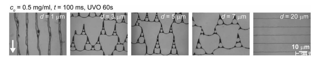圖 4 PS 模式作為設定距離 d 的函數(shù),具有常數(shù) co (co 5 0.5 mg/mL)、t (t 5 100 ms) 和 UVO 暴露時間 (60 秒)。 白色箭頭表示流動后退方向。