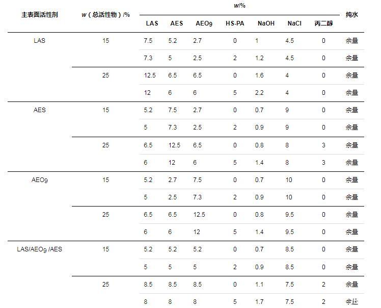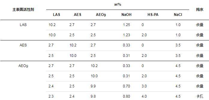 分別考察了在以LAS、AES和AEO9為主要表面活性劑的體系中,HS-PA作為改性聚丙烯酸/酯高分子表面活性劑可發(fā)揮的增稠以及去污效果。在配方設(shè)計上,總活性物質(zhì)量分數(shù)約為15%。由于HS-PA的增稠作用需要和NaCl協(xié)同起效,而不同配方的耐鹽性不同,因此,根據(jù)空白組(無HS-PA)配方黏度不反稀的NaCl用量,來確定同組樣品(含HS-PA)的NaCl用量,具體配方如表1所示(表中LAS、AES已換算為純質(zhì)量分數(shù),HS-PA(w=30%)未換算)。