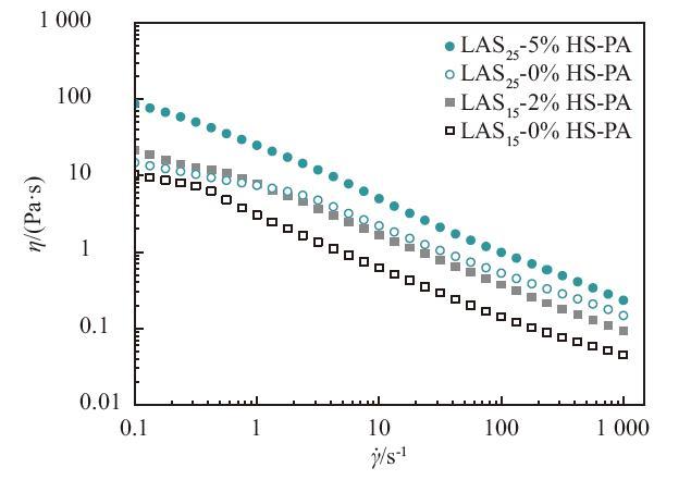 圖7為不同配方洗滌劑的表觀黏度隨剪切速率變化曲線,隨著剪切速率不斷增加,4個樣品的表觀黏度均逐漸減小,表現(xiàn)出剪切變稀的非牛頓流體行為。在恒定剪切速率下,體系中加入HS-PA將提高洗滌劑的黏度。結(jié)合偏光顯微鏡圖像可知,HS-PA的加入使得分子空間堆積構(gòu)型發(fā)生改變,體系中出現(xiàn)更多的球形層狀液晶,液晶結(jié)構(gòu)越多越完整,則說明其形成的聚集體中,分子排布越緊密且越有序,層間發(fā)生滑動時越困難,宏觀表現(xiàn)為黏度越大。當(dāng)無HS-PA影響時,在相同剪切速率下,活性物質(zhì)量分數(shù)越高,黏度越大。這可能是因為活性物質(zhì)量分數(shù)越大,表面活性劑分子之間作用力越強,分子鏈發(fā)生相對運動時的阻礙效果越明顯,黏度則越大。