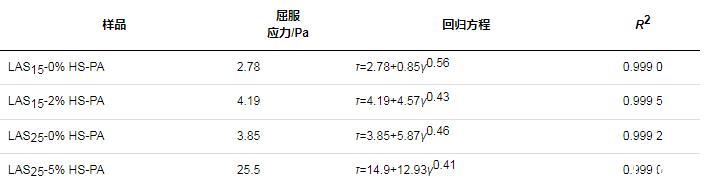 根據(jù)Herschel-Bulkley模型擬合的回歸方程及流變參數(shù)如表5所示(命名規(guī)則:主表面活性劑總活性物質(zhì)量分數(shù)-HS-PA用量),其中擬合曲線相關(guān)系數(shù)(R2)均不小于0.999,相關(guān)性較高,表明LAS體系的流變性可以利用Herschel-Bulkley模型進行研究。在活性物質(zhì)量分數(shù)為15%的體系中添加2%HS-PA,屈服應(yīng)力從原先的2.78 Pa提高至4.19 Pa,在25%活性物配方中加入5%HS-PA,屈服應(yīng)力由3.85 Pa提高至25.5 Pa,說明HS-PA的添加可以提高體系的屈服應(yīng)力。屈服應(yīng)力是指液晶結(jié)構(gòu)破壞時的臨界剪切應(yīng)力值。由前文研究結(jié)果可知,HS-PA的加入使配方獲得更多更致密的球形層狀液晶,因此,相應(yīng)地,體系屈服應(yīng)力也越大。而屈服應(yīng)力越大,當(dāng)體系中包含水不溶粒子(如微膠囊)時越容易穩(wěn)定,該結(jié)果與離心測試結(jié)果相契合。