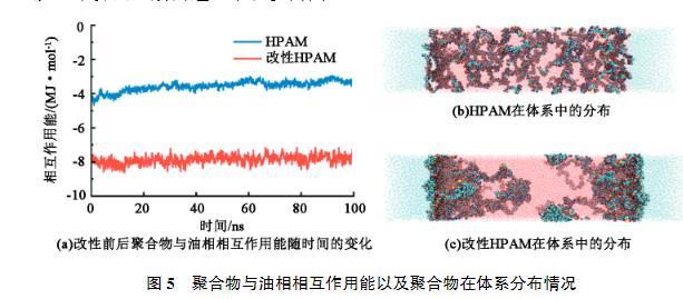 界面張力來自于界面處分子受到的應力不均衡,因此需要增加兩相之間的聯系,從而減少界面張力。由于HPAM分子本身親水,與水相具有較強的相互作用,因此主要考察HPAM和油相之間的相互作用強度。圖5(a)為HPAM和改性HPAM與油相的相互作用能隨時間的變化。可以看出,HPAM在0~100 ns的模擬過程中相互作用強度逐漸降低,說明部分HPAM從油水界面處脫離進入水相。由圖5(b)也看出HPAM分子大量均勻分布在水相中,其主要原因也是缺少親油基團,不易在界面處穩定存在,更傾向于溶解于水中。而引入疏水基團改性后的HPAM與油相的相互作用能明顯強于HPAM與油相的作用能。由圖5(c)看出改性HPAM大多數分布在油水界面附近。改性HPAM在界面處橋接了油相與水相,緩解了界面處分子應力不均衡,從而起到降低界面張力的效果。