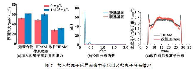 部分儲層中存在較高的礦化度,為此進一步研究鹽離子對界面張力的影響。在3個體系的水相中分別加入質量濃度為100 g/L的NaCl,觀察其對界面張力的影響情況,結果見圖7(a)。可以看出,對于沒有聚合物存在的體系中,界面張力會隨著鹽離子的增加而增大。這是由于鹽離子的存在增大了水相的極性,從而拉大了油水兩相性質上的差距,增大了油水界面張力。因此當界面處的鹽離子增多時,界面張力則會增大。加入HPAM的體系中也出現了類似的情況。然而引入磺酸基團改性后的HPAM則受鹽離子的影響較小。為了解釋這一現象的物理機制,分析了帶電基團周圍Na+分布(圖7(b))。通過計算徑向分布函數g(r),發現羧酸基團周圍吸引了較多的Na+,導致Na+在聚合物附近聚集,而改性引入的磺酸基團具有一定的抗鹽作用,其周圍分布的Na+數量更少。這也就導致2種體系界面附近Na+密度不同(圖7(c))。由于HPAM含有較多的羧酸基團,會引起Na+在聚合物附近的富集,導致界面張力的增加。而在加入改性HPAM后,引入的磺酸基團對Na+的吸引力較弱,導致界面附近的Na+和改性前相比有明顯的減少,界面張力增加較少。因此加入磺化改性的HPAM在高礦化度下仍然可以保持較高的界面活性。