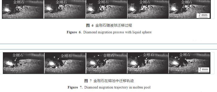 圖8為金剛石置于釬料底部時,金剛石在激光釬涂過程中運動軌跡??梢?,無論金剛石是直接鋪置于釬料表面,還是置于釬料底部,在釬涂過程中,金剛石均會上浮到涂層表層。具體過程為在激光熱源作用下,表層的釬料開始熔化成液態(tài)小球,由于金剛石的高透光性和高熔點,金剛石不會熔化。在液態(tài)小球聚集長大的過程中,金剛石沿著液球邊緣運動,當(dāng)液態(tài)小球匯入大熔球時,金剛石繼續(xù)沿著大熔球的邊緣向表面運動,最后凝固于釬料涂層表層。