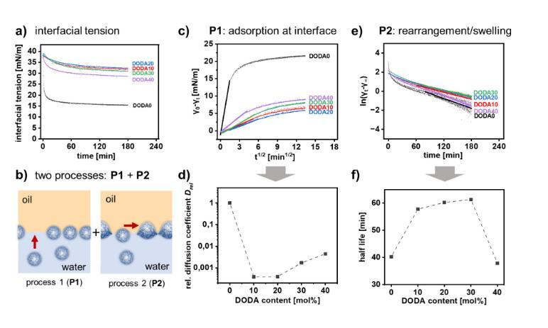 圖3展示了不同疏水性納米凝膠(ANGs)在甲苯/水界面張力(IFT)方面的研究結果。隨著ANGs的疏水性增加,甲苯/水界面張力隨時間非線性降低,但不同ANGs的降低速率不同(圖3a)。IFT的降低分為兩個階段:初始快速降低(P1)和隨后緩慢松弛到平衡狀態(tài)(P2)(圖3b)。通過分析P1階段,可以得到描述ANGs界面吸附速率的擴散系數(shù)D(圖3c)。不同ANGs的相對擴散系數(shù)Drel(相對于DODA0)與ANGs的DODA含量相關:親水的DODA0和疏水的DODA40顯示出最快的界面吸附速率(圖3d)。通過分析P2階段,可以得到描述ANGs重新排列速率的半衰期(圖3e)。半衰期與ANGs的DODA含量相關:親水的DODA0和疏水的DODA40顯示出最快的重新排列速率(圖3f)。