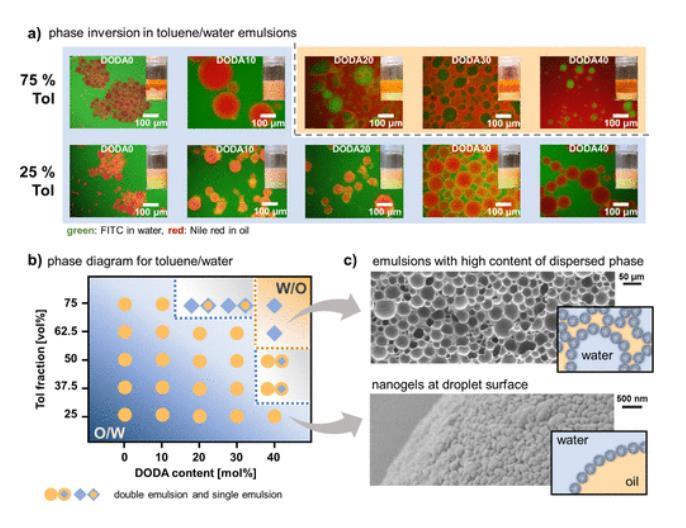 圖2展示了使用不同親水性納米凝膠(DODA含量)制備的甲苯/水Pickering乳液的類型。具體來說,圖2a通過熒光顯微鏡圖像和照片顯示了不同DODA含量下的甲苯/水乳液,其中25 vol%的甲苯觀察到O/W乳液,而在75 vol%的甲苯中,從DODA10到DODA20觀察到從O/W到W/O的相變。圖2b總結了甲苯/水乳液系統(tǒng)中乳液類型對納米凝膠的DODA含量和乳液的油相體積分數(shù)的依賴性。圖2c通過SEM圖像展示了高分散相含量(DODA40,Tol-75)乳液和納米凝膠(DODA20,Tol-25)在粒子/液滴表面的存在。