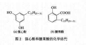 從圖1可以看出,兩種生物質腰果酚磺酸鹽的收率隨著反應溫度的升高先增加隨后變化較緩,而活性物含量先增大后減小。在磺化溫度為25℃時,不飽和腰果酚磺酸鹽和飽和腰果酚磺酸鹽的活性物含量達到最大值,分別為84.0%和98.7%,此時收率也較高,分別為85.0%和88.9%。當磺化溫度高于25℃時,兩種腰果酚磺酸鹽的活性物含量降低,收率變化較小。分析原因可能為,磺化溫度太高,會導致過磺化,生成的副產物水溶性較差,導致活性物含量較低。在相同條件下,飽和腰果酚磺酸鹽的收率和活性物含量高于不飽和腰果酚磺酸鹽,這主要是由于不飽和腰果酚中含有一定量的雜質強心酚和腰果酸,結構見圖2。這兩種物質的結構與腰果酚的結構相似,分離難度較大;且這兩種物質也發生磺化反應,導致不飽和腰果酚磺酸鹽的活性物含量較低。然而通過對不飽和腰果酚進行側鏈加氫生成飽和腰果酚后,物理性質發生變化,飽和腰果酚為棕色固體,強心酚和腰果酸為液體,很容易分離。因此,飽和腰果酚磺酸鹽的活性物含量高于不飽和腰果酚磺酸鹽。