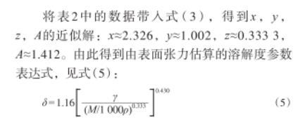 將表2中的數(shù)據(jù)帶入式(3),得到x,y,z,A的近似解:x≈2.326,y≈1.002,z≈0.333 3,A≈1.412。由此得到由表面張力估算的溶解度參數(shù)表達(dá)式,見(jiàn)式(5):