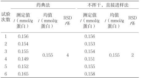 由表3可知,藥典方法測得的9次回收率的平均值為97.7%,RSD值為1.70%;不揮干,直接進樣法測得的9次回收率的平均值為99.7%,RSD值為1.55%。對兩組數據進行單因素方法分析,F=7.530,P=0.02<0.05,兩組數據有顯著性差異。方法優化后準確度更接近100%,這是因為優化后的方法不受揮干速度的影響[3],進樣溶液比藥典方法均勻,損失量相對較小。