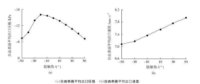 表面張力系數(shù)取50N/mm,接觸角取值為-50°~50°時得到的自由表面出口壓強與自由表面出口平均速度曲線如圖10所示。