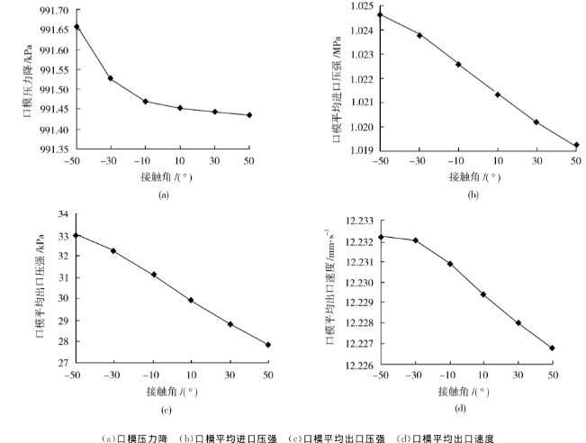 在表面張力系數(shù)為50N/mm不變時,接觸角取值:-50°~50°。得到口模壓力降、口模平均進出口壓力、以及口模出口平均速度曲線如圖8所示。由圖8可知,接觸角與口模流場參數(shù)的關系并不是線性關系。由圖6可知接觸角θ增大,自由表面擠出脹大比值減小,φ減小,表面張力對口模出口處的軸向分力如式(9)所示,牽引力隨著夾角φ值的減小而增大,使得材料在口模內的剪切能量損失減小,因此壓力降減小。所以圖8(a)中口模平均進出口壓力降減小。而圖8(b)、(c)中口模內熔體進出口壓強的減小是因為擠出脹大減小,自由表面對外做功減小,自由表面對口模的阻力減小。圖8(d)中口模平均出口速度減小是因為表面張力對自由表面的徑向分力減小,口模內熔體出口徑向速度減小,而熔體軸向速度不變,因此平均速度減小。