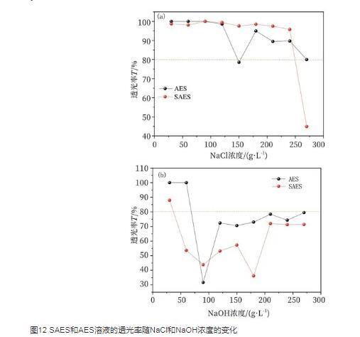 圖12 SAES和AES溶液的透光率隨NaCl和NaOH濃度的變化