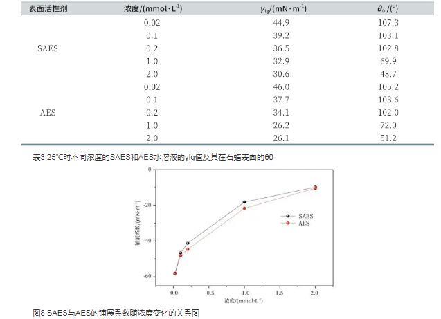 表3 25℃時不同濃度的SAES和AES水溶液的γlg值及其在石蠟表面的θ0