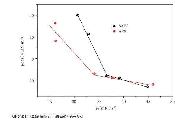圖9 SAES與AES的黏附張力與表面張力的關(guān)系圖
