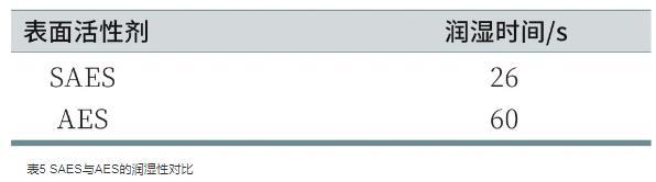 潤濕性是表面活性劑的基本應(yīng)用性能之一。帆布沉降法測定的是表面活性劑溶液對棉布的潤濕效果,潤濕過程的快慢取決于表面活性劑的性質(zhì)。由表5可知,SAES、AES對帆布片的潤濕時間分別為26 s和60 s,表明SAES的潤濕性優(yōu)于AES,這是由于SAES結(jié)構(gòu)中存在支鏈,表面活性劑分子從水溶液中遷移到氣-液界面的速率較快,容易擴散到纖維表面,降低帆布片表面張力的能力較強,從而具有較好的潤濕性。