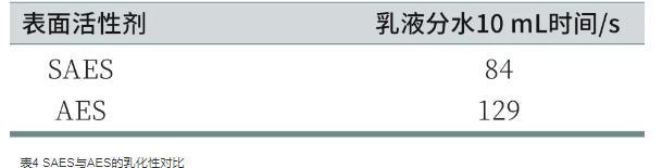 乳化作用是在一定的外力作用下使不混溶的兩種液體形成具有一定穩(wěn)定性的液液分散體系的作用,該分散體系被稱為乳狀液,是一種熱力學(xué)不穩(wěn)定體系。為了評估SAES和AES的乳化性,采用量筒法測定了二者對液體石蠟的乳化能力,記錄從乳液中分離出10 mL水所需要的時間,時間越長,乳化性能越好。SAES與AES的乳化性對比如表4所示。從表中可以看出,SAES的乳化性低于AES,這可能是因為SAES分子中的支鏈結(jié)構(gòu),使得其分子總體積相對較大,在空間位阻以及電性斥力作用使疏水基難以插入油相中,即與液體石蠟之間的相互作用較弱,乳化性較差。