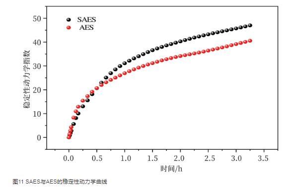 穩(wěn)定性動力學(xué)指數(shù)(di)反映的是樣品在整個放置時間濃度和顆粒粒徑的變化幅度的綜合值,穩(wěn)定性動力學(xué)指數(shù)越大,系統(tǒng)越不穩(wěn)定。圖11為SAES與AES的穩(wěn)定性動力學(xué)曲線,從圖中可以看出,在開始的0.5 h內(nèi),SAES與AES的穩(wěn)定性動力學(xué)指數(shù)幾乎相同,但隨著時間的增加,SAES的穩(wěn)定性動力學(xué)指數(shù)明顯高于AES,說明在開始的0.5 h內(nèi),二者的泡沫穩(wěn)定性幾乎相同,但是隨著時間的延長,SAES體系的穩(wěn)泡性明顯弱于AES,這是由于帶有一定支鏈的SAES分子在氣-液界面上形成的表面膜黏度低,不夠緊密結(jié)實,泡沫穩(wěn)定性較差。
