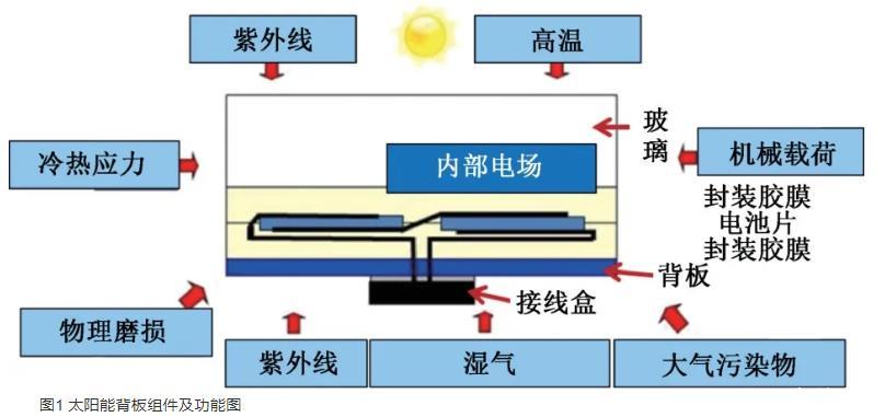 太陽能光伏背板位于光伏組件的背面,是光伏組件的重要組成部分,而背板作為直接與外部環(huán)境大面積接觸的光伏封裝材料,必須具備卓越的耐老化(濕熱、干熱、紫外)、耐電氣絕緣、水蒸氣阻隔、尺寸穩(wěn)定等性能,為組件在各自長期惡劣環(huán)境下提供絕緣保護(hù)和支撐作用,如圖1所示。