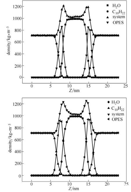 對于表面活性劑來說降低界面張力的能力是考察其性能好壞的重要指標之一,下面通過考察不同體系的界面張力和界面寬度來進一步說明OPES的界面性能,如表1所示。對于界面張力可以利用式(2)來計算,其中LZ為盒子高度;Pxx、Pyy、Pzz分別為x、y、z方向的壓力。