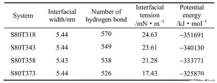 表2通過界面張力、表面活性劑與水的氫鍵數(shù)量、勢能3組數(shù)據(jù)對比得出表面活性劑的界面張力隨著溫度升高而降低的結論。數(shù)據(jù)表明在4組模擬實驗過程中,界面的寬度并沒有發(fā)生改變。因此界面張力下降的主要原因是由于OPES勢能的降低導致分子之間的作用力也隨之降低。