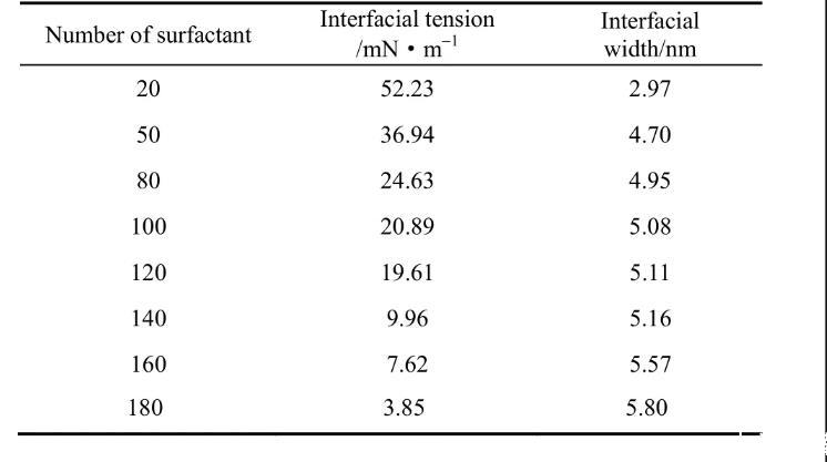 從表1可以發(fā)現(xiàn)表面活性劑數(shù)量的增加使得界面張力逐漸下降。其中當OPES數(shù)量由20增加到80時,界面張力值較高,這說明當表面活性劑濃度較低時并不能起到很好的降低界面張力的作用;隨著表面活性劑數(shù)量進一步增加界面張力逐漸下降,當OPES數(shù)量為180時,達到臨界飽和狀態(tài),此時界面張力僅為3.85 mN·m-1,此變化規(guī)律與真實實驗規(guī)律相同。這同時也說明辛基酚聚氧乙烯醚磺酸鹽可以很好地降低界面張力,是一種性能優(yōu)良的表面活性劑。界面寬度用體系密度圖中表面活性劑的密度曲線寬度來表示。隨著表面活性劑個數(shù)增加界面寬度遞增,起初界面寬度增加速度較快是因為界面OPES濃度過低并未飽和;當OPES數(shù)量達到100~140時,界面寬度僅有少量緩慢增加這是由于此時界面正在逐漸接近飽和狀態(tài)。隨著OPES的數(shù)量達到160和180時,界面寬度增加幅度變大,進一步驗證此時界面已達到飽和狀態(tài)。