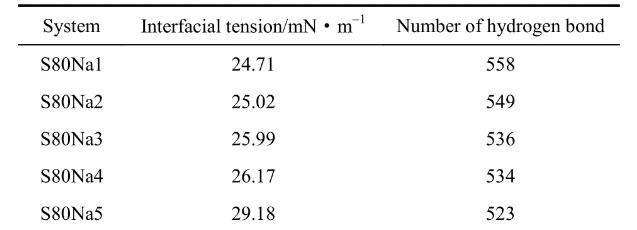 表3不同濃度Na+溶液體系界面張力以及OPES與H2O的氫鍵數(shù)量