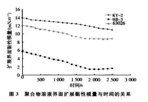 圖2、圖3分別是用蒸餾水配制濃度為1 500 mg/L的3種聚合物溶液測量的擴(kuò)展彈性模量、擴(kuò)展界面黏性模量。界面活性較高的聚合物(HB-3)的界面彈性模量在20~27 mN/m之間變化,其它兩種聚合物的界面擴(kuò)展彈性模量為60~70 mN/m。其相應(yīng)的界面黏性模量比界面彈性模量低,說明三種聚合物溶液的界面擴(kuò)展彈性占主導(dǎo)。綜上所述,聚合物(KY-2)界面擴(kuò)展黏彈性最好,說明界面層中聚合物分子之間以及聚合物與油分子之間作用比另外兩種聚合物界面層的分子間作用大。
