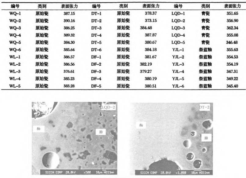 (2)根據(jù)測試所得無錫鴻山越墓、德清出土原始瓷和龍泉青瓷、景德鎮(zhèn)祭藍(lán)釉樣品的元素組成,計(jì)算得出了各樣品的高溫表面張力,結(jié)果表明無論是無錫鴻山越墓,還是德清窯址出土原始瓷釉的表面張力均明顯大于(普遍偏大10%左右)包括宋代龍泉青瓷和元代景德鎮(zhèn)祭藍(lán)釉在內(nèi)的后期成熟瓷釉。