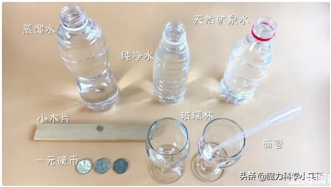 為何會出現(xiàn)這個結(jié)果呢?這是水的表面張力引發(fā)的現(xiàn)象。由于蒸餾水和純凈水里面的礦物質(zhì)等微量元素已經(jīng)除去,而天然礦泉水中含有較豐富的礦物質(zhì),因而水的表面張力略大于其它兩種水。所以,在同樣大小的硬幣表面能夠承受更多的液滴。