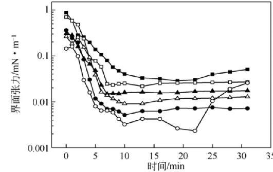 圖8 C14 DEA對(duì)GYD油/水動(dòng)態(tài)界面張力的影響