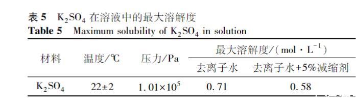 表5列出了K2SO4的最大溶解度。結(jié)果表明,SRA確實(shí)會降低K2SO4的最大溶解度。但是,對比圖5可以發(fā)現(xiàn),漿體孔溶液中的K+和SO42-的濃度還遠(yuǎn)遠(yuǎn)未達(dá)到K2SO4的最大溶解度。因此,并不能依據(jù)SRA會降低K2SO4最大溶解度的結(jié)果判定這是B組溶液中SO42-濃度低的原因,還需要研究K2SO4在SRA中的溶解速度。