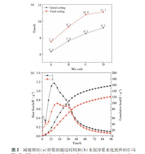 圖2減縮劑對(a)砂漿的凝結(jié)時(shí)間和(b)水泥凈漿水化放熱的影響