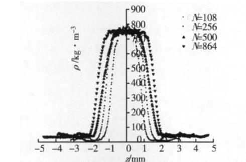 在溫度500 K和截斷半徑rc=0.9498 nm的條件下,當模擬分子數N=108、256、500和864時,模擬得到的密度分布見圖9。統計得到的汽相主體密度ρV、液相主體密度ρL及汽液界面厚度d見表5。