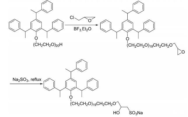 采用“一鍋煮”法制備表面活性劑,合成路線如圖1所示。將一個帶有機械攪拌器,回流冷凝管和恒壓滴液漏斗的500 mL三頸瓶置于80℃的恒溫水浴中,先后加入92 g的三苯乙烯苯酚聚氧乙烯醚-25和75 mL的正庚烷,向攪拌后形成的溶液中加入2 mL的三氟化硼乙醚催化劑,用恒壓滴液漏斗滴加過量的環(huán)氧氯丙烷溶液,滴加完后升溫至90℃反應3 h;然后滴加20%NaOH水溶液,維持反應體系的pH值在7.5~9,TLC監(jiān)測反應進程到原料點消失后結束反應。向產(chǎn)物中加入二甲亞砜,溶解后過濾除去反應中生成的鹽;用正庚烷萃取、水洗后旋轉蒸發(fā)除去溶劑;將粗產(chǎn)物溶解于乙醇中,向其中滴加100 mL的25%的亞硫酸鈉溶液,分批加入6 mol/L的鹽酸溶液維持反應體系的pH值在7~9,在80℃的恒溫水浴中繼續(xù)反應過夜,將反應物用熱的異丙醇萃取后過濾除去無機鹽,將濾液旋轉蒸發(fā)除去溶劑得到黃色產(chǎn)物三苯乙烯基聚氧乙烯醚羥丙基磺酸鈉,即為表面活性劑TPHS。
