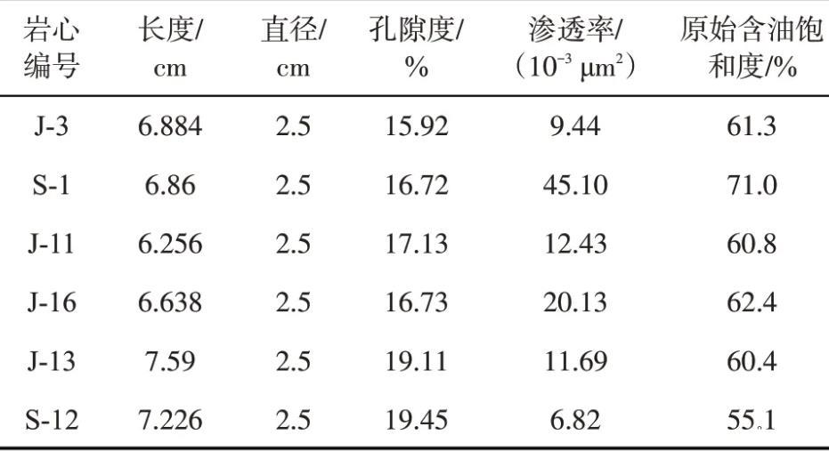 為驗證TPHS活性納米流體在滲吸采收率的應(yīng)用,采用靜態(tài)滲吸實驗開展TPHS及常見表面活性劑復(fù)配溶液滲吸效果對比研究,巖心的基本物性參數(shù)見表2,不同體系與原油間的界面張力、所計算的反邦德數(shù)和滲吸采收率結(jié)果見表3,結(jié)果表明在滲吸過程中毛管力起主導(dǎo)作用。