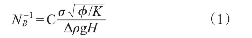 NB-1為滲吸機理判別參數(shù),式中沒有考慮巖石潤濕性。NB-1>5時,毛管力在滲吸作用中起主導(dǎo)作用;1<NB-1<5時,重力和毛管力同時起作用;NB-1<<1時,重力起主導(dǎo)作用。