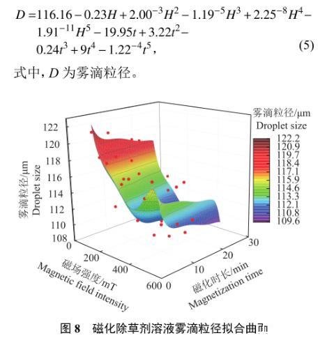 2)對磁化除草劑溶液表面張力和噴霧霧滴粒徑進行擬合處理,洛倫茲擬合模型最符合除草劑溶液表面張力受磁場強度和磁化時長影響的變化規律,以洛倫茲模型函數作為表面張力與磁場強度和磁化時長的函數關系式;多項式擬合模型能有效描述除草劑溶液噴霧霧滴粒徑受磁場強度和磁化時長影響的變化規律,以固定磁場強度調整磁化時長的方法給出了350 mT磁場下調控噴霧滴粒徑的函數關系式。