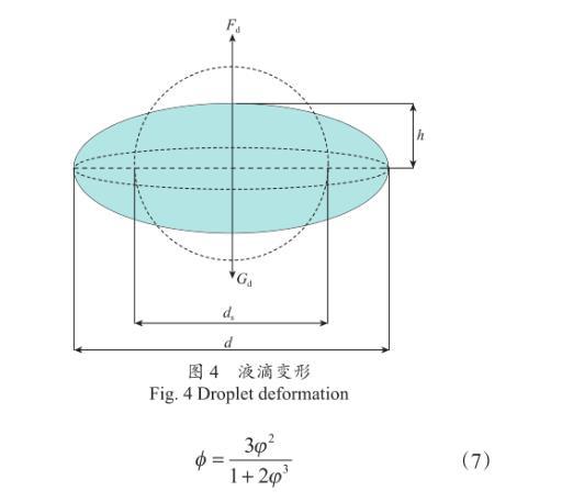 如圖4所示,ds為球形液滴的直徑,m;d為液滴變形后迎風面直徑,m;h為橢球體短軸高度,m。液滴等效直徑比φ為球形液滴直徑與變形后迎風面直徑比,即φ=ds/d。當液滴為橢球形時,其表面積近似為