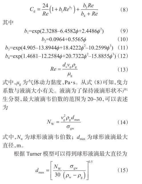 式中,φ為液滴變形程度系數,為與變形液滴體積相等的等效球形表面積與實際液滴表面積的比值。當氣液相對速度不大時,液滴保持球形,可以利用球形液滴曳力系數計算攜液臨界流量,但是當液滴發生變形以后,曳力系數和液滴迎風面積相應的發生改變,用球形液滴曳力系數計算誤差可能高達30%,對于非球形剛性顆粒,可以應用如下曳力系數表達式進行計算: