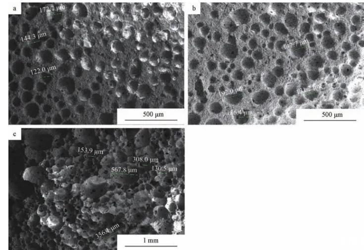 圖2不同SDS摻量(a:0.04%;b:0.08%;c:0.1%)的多孔陶瓷樣品的SEM照片