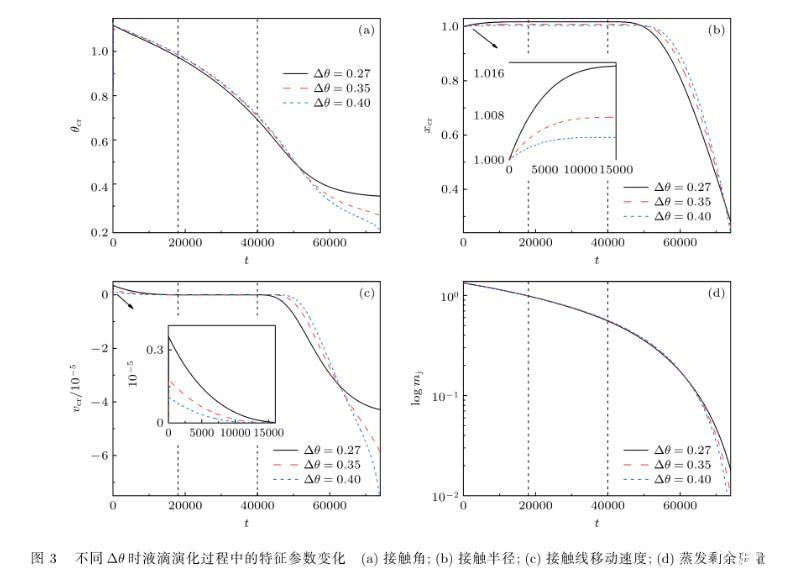 由表1可知,Δθ=0.27下液滴開始釘扎和去釘扎的時刻分別為t=18910和t=39750,Δθ=0.35下開始釘扎和去釘扎的時刻為t=16530和t=43250,而Δθ=0.40下則為t=14620和t=45100,即接觸線釘扎開始時刻提前,去釘扎時刻延后.由此可知,增大遲滯角,延長了接觸線釘扎時間,縮短了鋪展階段和去釘扎階段時長,同時加快了液滴蒸干歷程.