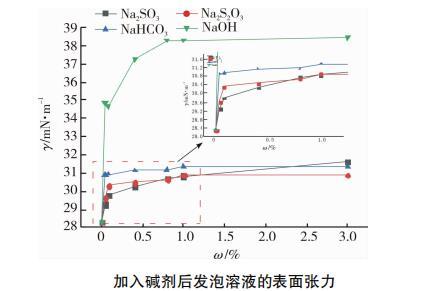 圖4是不同質量分數堿劑發泡液表面張力的測試結果。強堿NaOH使發泡液表面張力明顯提高,在NaOH質量分數3%時達到最大值38.3mN/m,隨后發泡液表面張力值保持穩定,不受NaOH含量變化影響。說明NaOH濃度升高時OH-過多,造成圖4加入堿劑后發泡溶液的表面張力表面活性物質停留于溶液表面,阻礙了OH-與更多表面活性物質的反應機會,溶液表面張力不再受影響。圖4中弱堿Na2S2O3,NaHCO3變化規律與NaOH相似,低濃度時發泡液表面張力激增,達到質量分數0.8%之后,表面張力值增幅減緩。NaOH加入使發泡液表面張力增加了35.7%,而其他3種弱堿無機鹽在濃度最大時(質量分數3%)僅增加約10%.與強堿劑相比,弱堿劑對溶液表面張力影響較小。