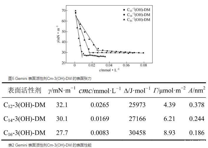 (2)測定了Cm-3(OH)-DM在水溶液中的表面張力、cmc以及其熱力學常數,得到其cmc分別為0.0265mmol/L、0.0169mmol/L、0.0083mmol/L,γcmc分別為32.1mN/m、30.1mN/m、27.7mN/m。以上數據表明與對應的傳統單子表面活性劑相比,Gemini表面活性劑Cm-3(OH)-DM(m=12,14,16)具有很好的表界面活性。