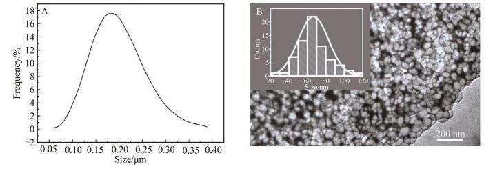 圖1硅丙乳液的粒徑分布(A)和TEM圖像(B)