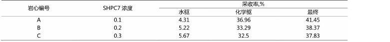 由此,通過表2看出,在增大SHPC7表明活性劑的濃度下,其驅油效果在不斷增加。但是在0.3%的濃度下其驅油采收率小于濃度為0.2%的采收率。根據上述的結果得出,在實際的應用中,應選擇SHPC7表明活性劑濃度大小為0.2%的濃度,此時采收率最高。