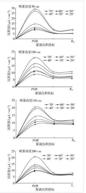 圖5不同噴霧距離和葉傾角條件下的流失點(diǎn)(POR)和最大穩(wěn)定持留量(Rm)