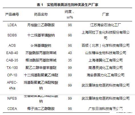表1實(shí)驗(yàn)用表面活性劑種類及生產(chǎn)廠家
