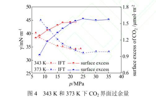圖4 343 K和373 K下的界面張力和CO2界面過余量